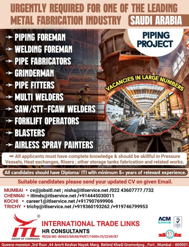 Applicants must have knowledge & skills in pressure vessels, heat exchanges, risers, other storage tanks fabrication & related works