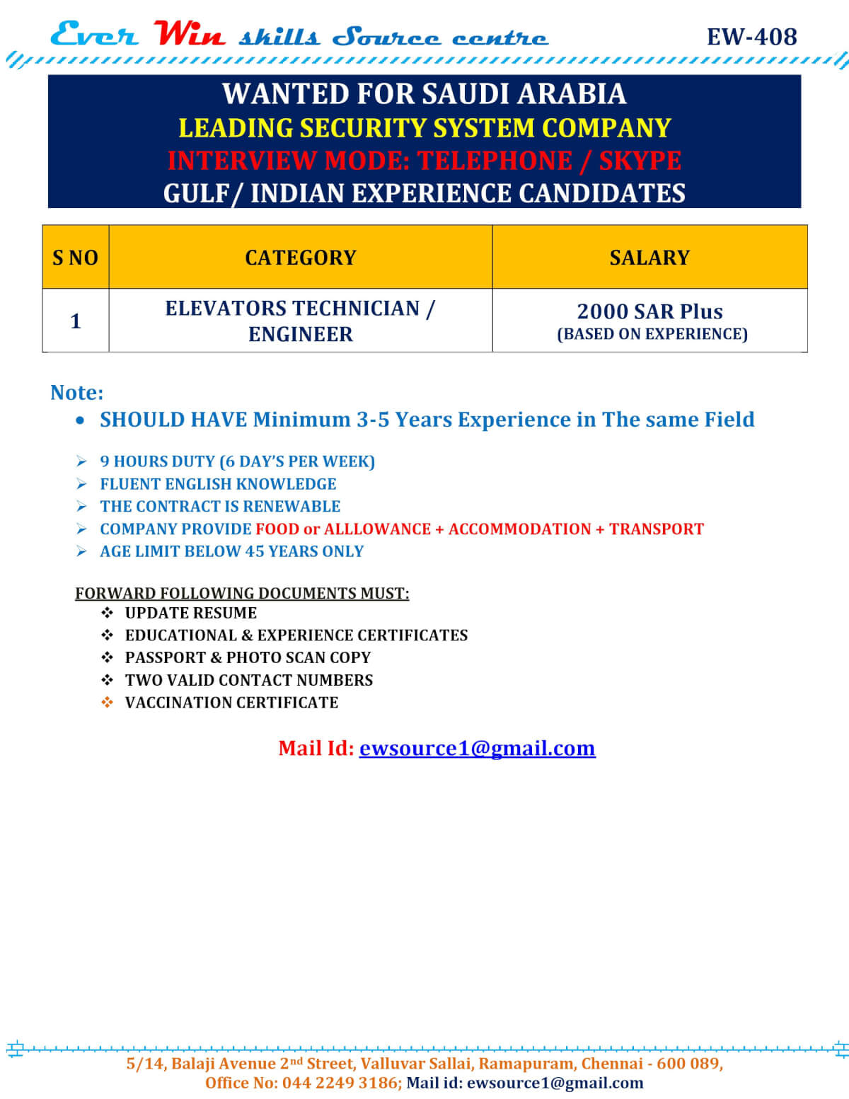 Elevator job Vacancy in Saudi Arabia - Security System Company