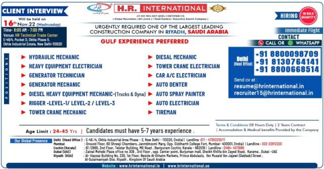 Email: resume@hrinternational.in, recruiter15@hrinternational.in
