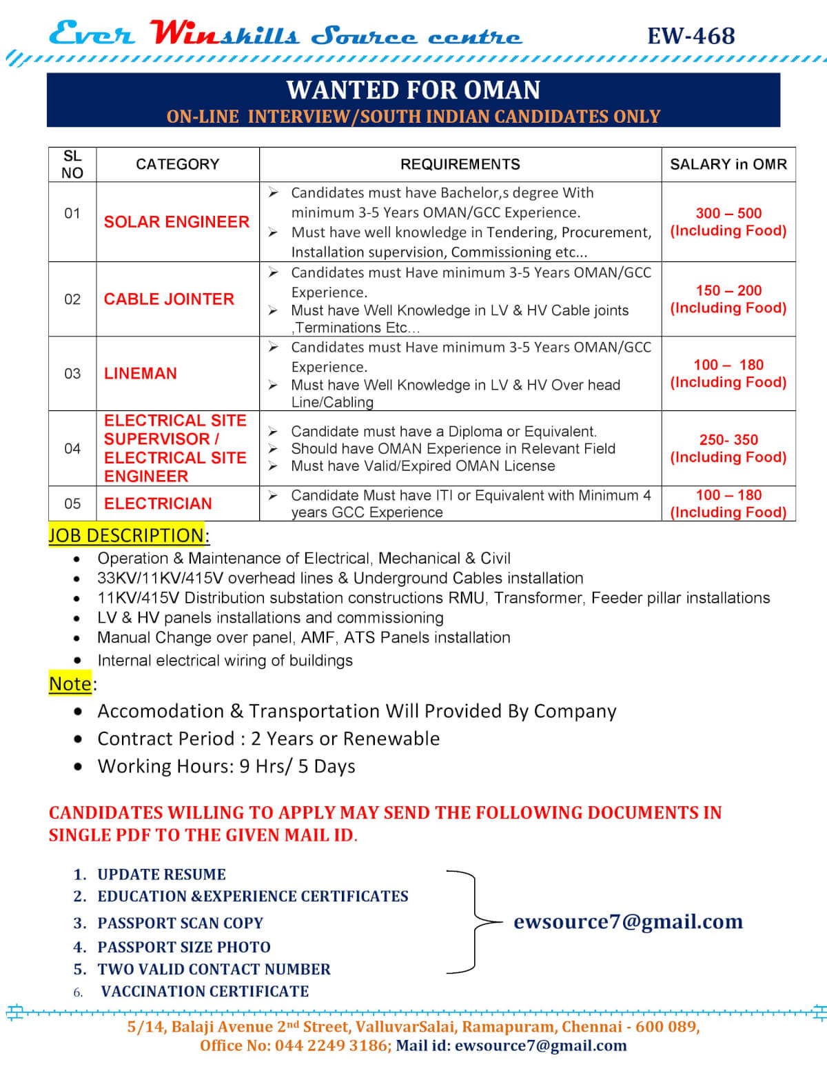 | Electrical site engineer/site supervisor | 350 OMR | |