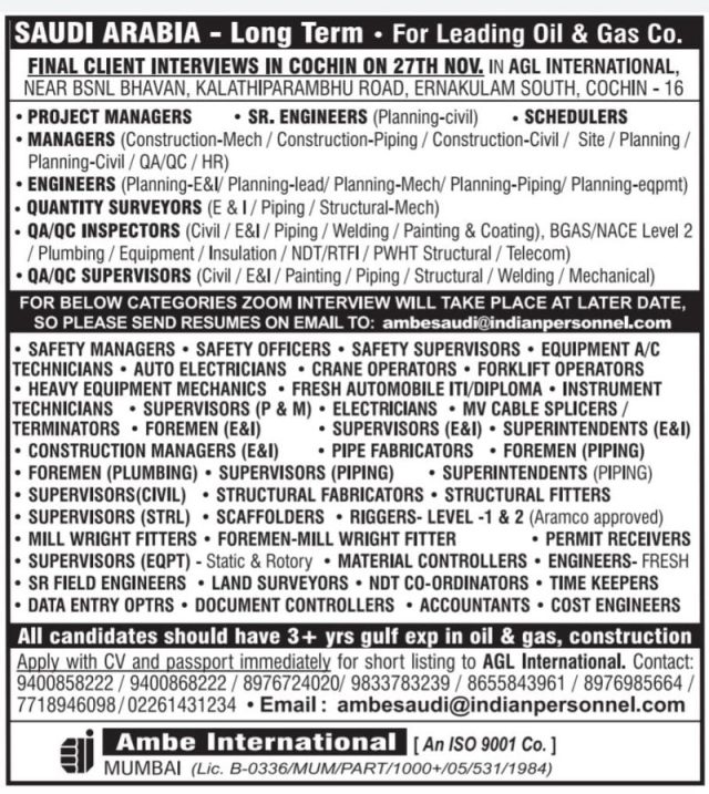 | Managers (construction - mech/construction - piping/construction - civil/site/planning/planning civil/QA/QC/HR) | ||