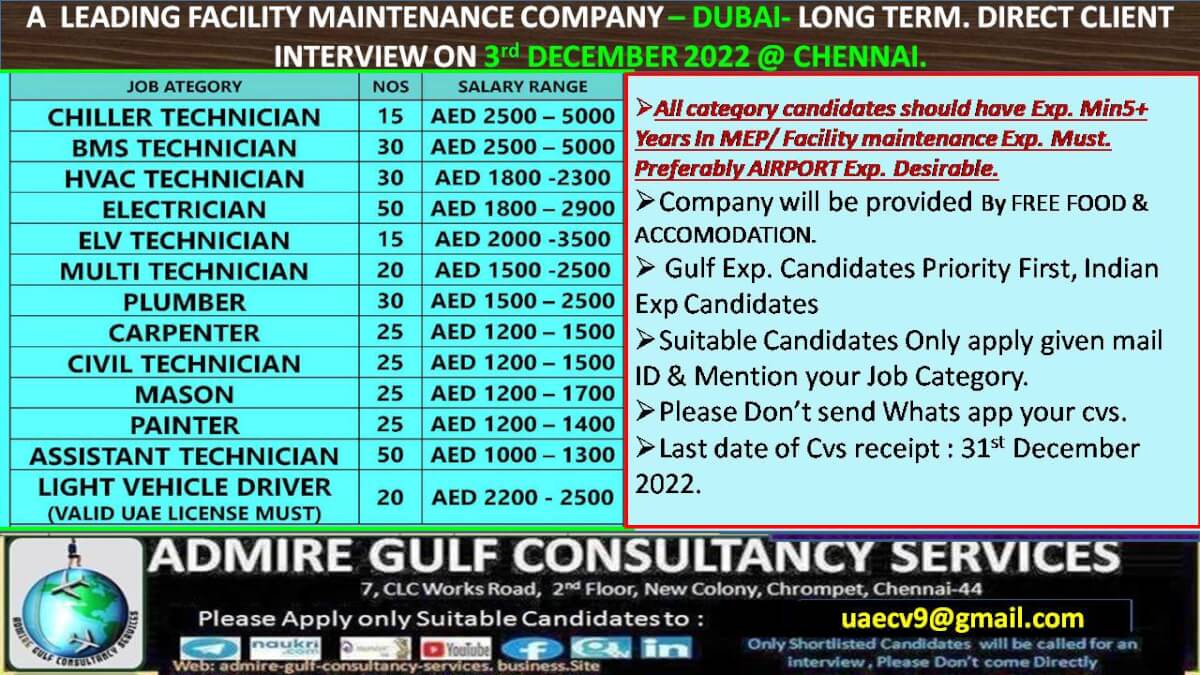 | Chiller technician | 15 | 5000 AED |