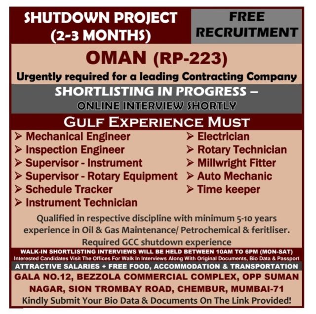 Free recruitment to shutdown project in Oman