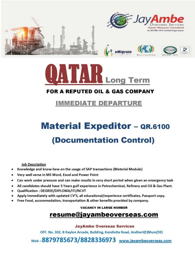 Material Expeditor job in Qatar - Oil & Gas Company