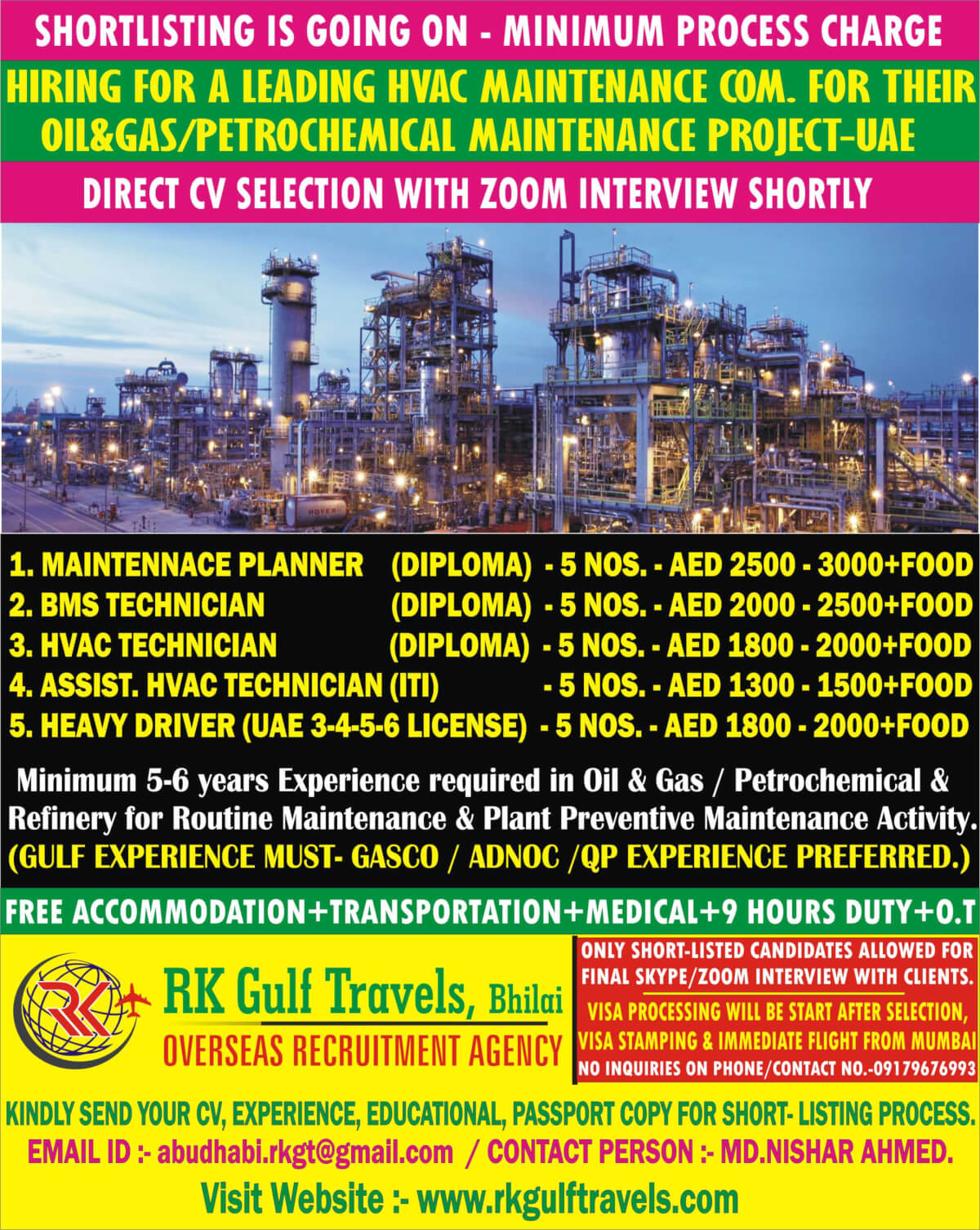 Minimum 5 - 6 years experience required in oil & gas/petrochemical & refinery for routine maintenance & plant preventive maintenance activity