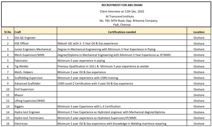 Urgent job vacancies in Abu Dhabi - Onshore Project