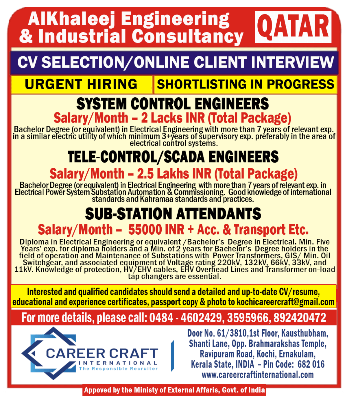 Al Khaleej Engineering & Industrial Consultancy - Hiring for Qatar