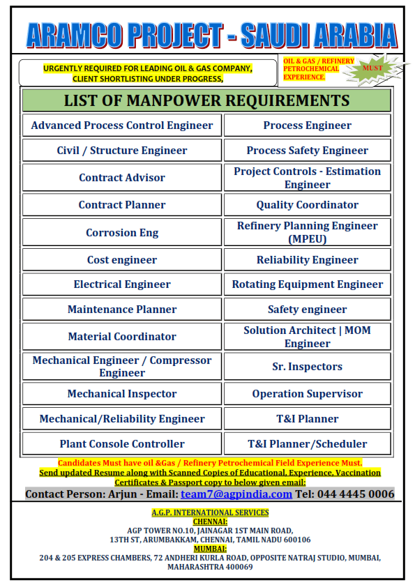 Candidates must have Oil & Gas / Refinery Petrochemical field experience must.