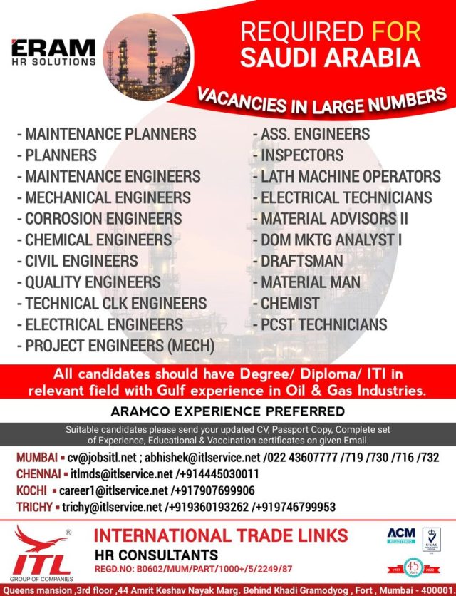 All Candidates should have Degree / Diploma / ITI in relevant field with Gulf Experience in Oil & Gas Industries, Aramco Experience Preferred