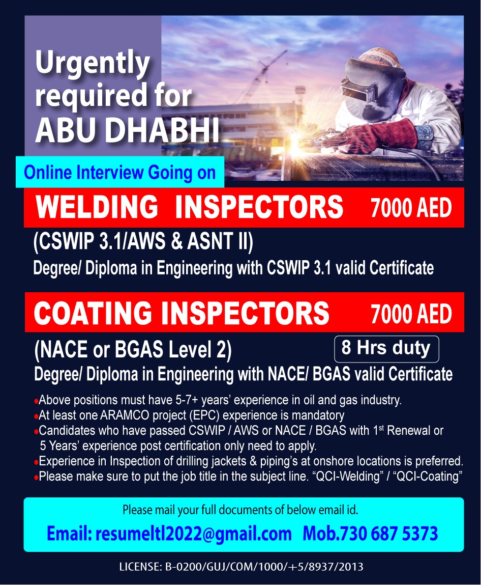 Degree/Diploma in Engineering with NACE/BGAS valid Certificate. Above position must have 5-7 years experience in Oil & Gas Industry. At least one ARAMCo project EPC experience is mandatory. Candidate who have passed CSWIP/AWS or NACE/BGAS with 1st Renewal or 5 years experience post certification only need to apply. Experience in Inspection of Drilling Jackets & Piping's at onshore location is preferred. Please make sure to put the Job title in ther subject line "QCI-Welding / "QCI-Coating"