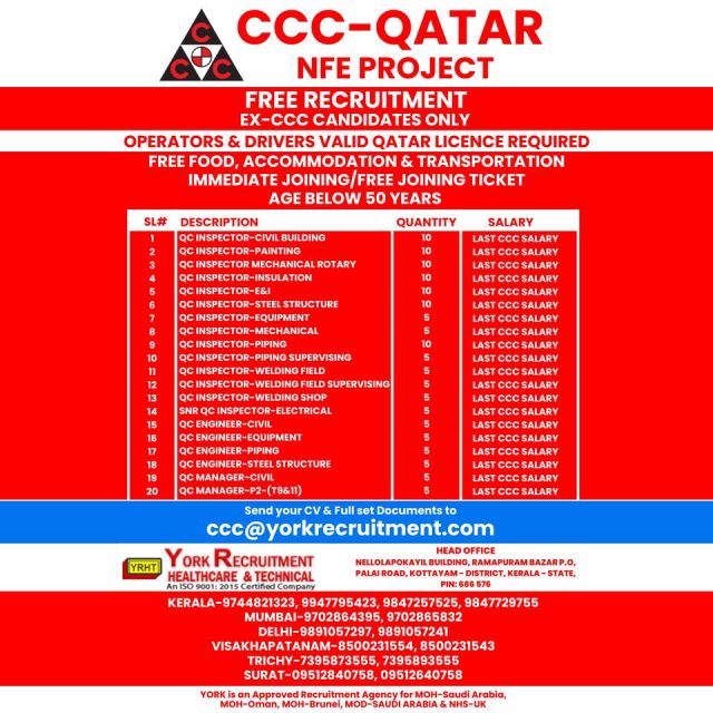 EX-CCC Candidates only, Operators & Drivers Valid Qatar Licence required, Age below 50 years