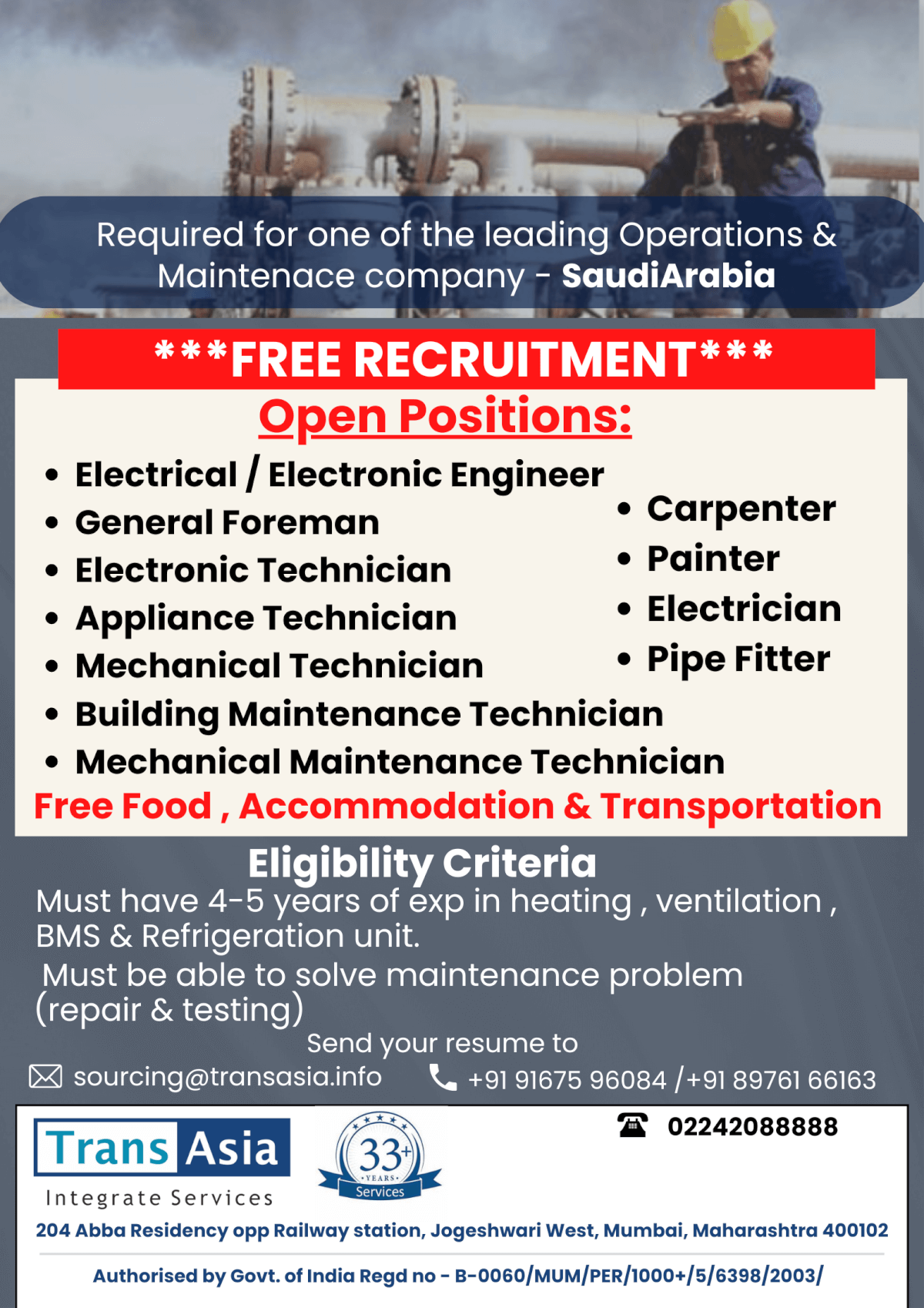 Free recruitment to Saudi arabia - Operation & Maintenance Company