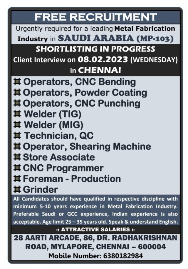 Free recruitment to Saudi arabia - Metal Fabrication Industry