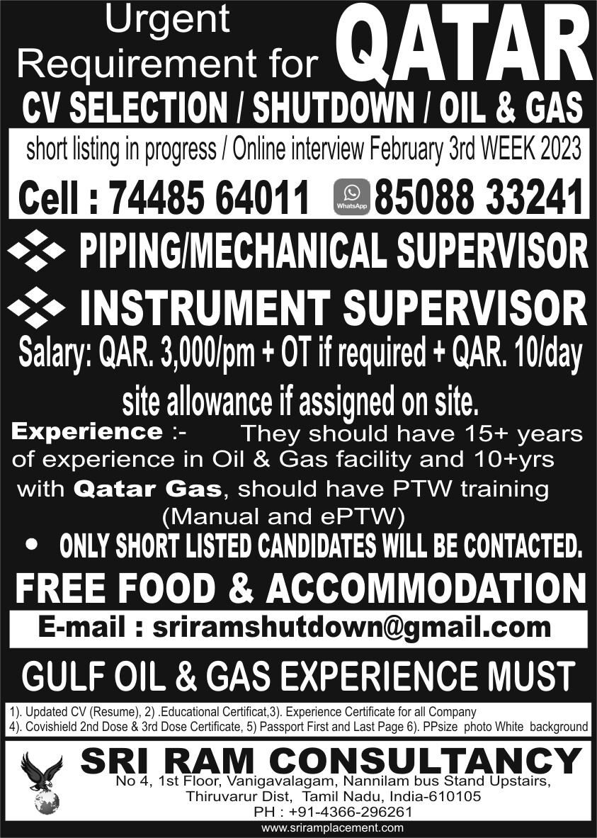 Candidates must have 15 + years experience in oil & gas facility & 10 years with Qatar gas.
