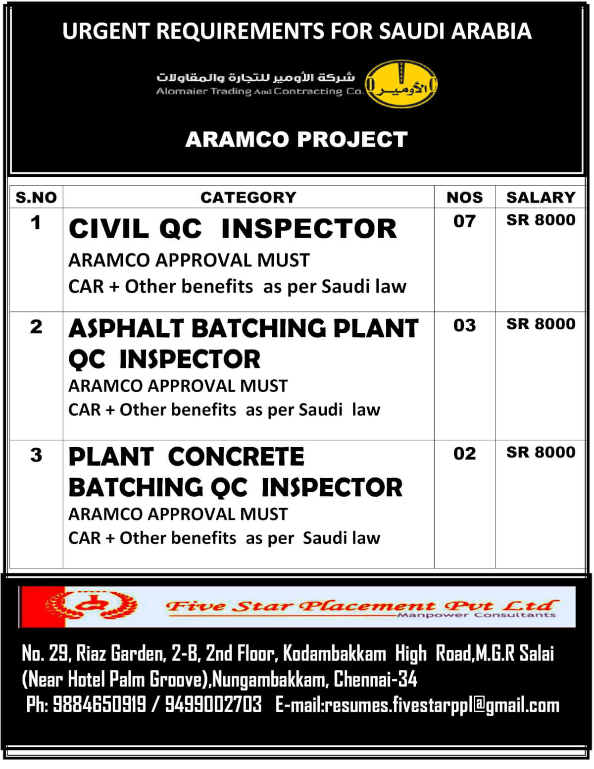 | Asphalt batching plant QC inspector | 3 | 8000 SAR |