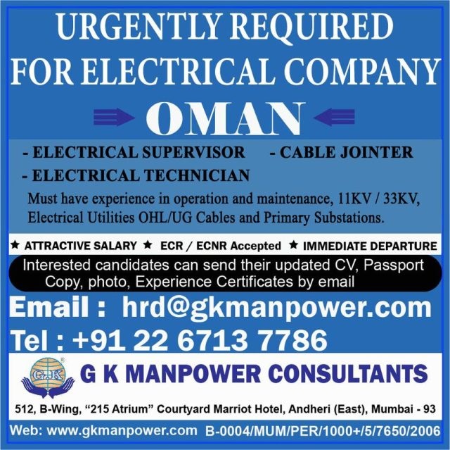 Must have experience in Operation and Maintenance, 11KV / 33KV, Electrical Utilities OHL/UG /cables and Primary Substations. ECR/ECNR Accepted