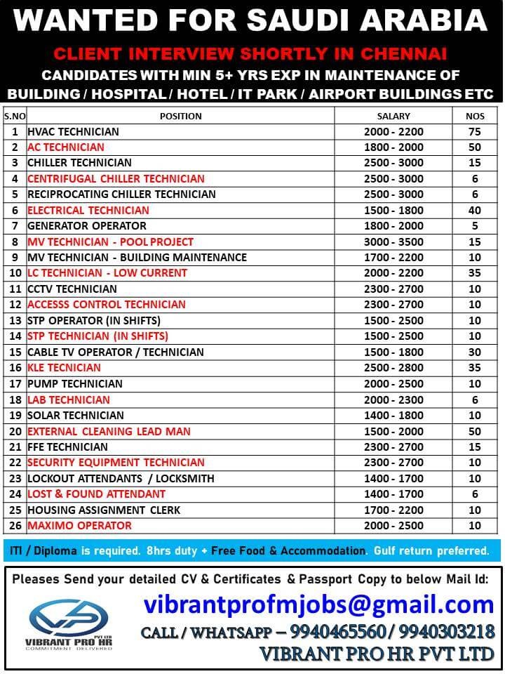 | MV technician - building maintenance | 10 | 2200 SAR |