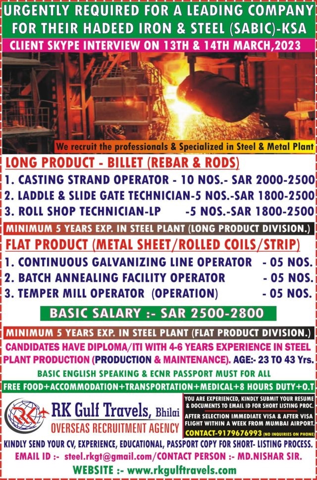 Hadeed steel plant vacancy 2023 - Urgently required