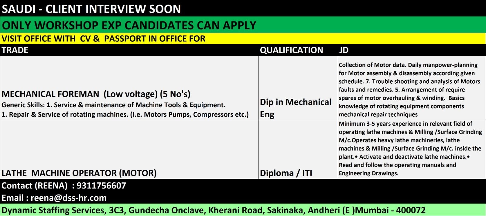 Email: reena@dss-hr.com / 9311756607
