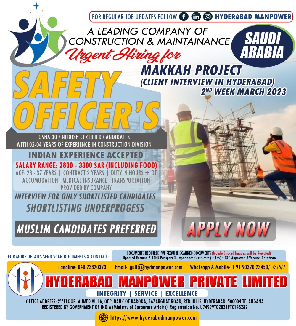 Safety officer job vacancy in Saudi arabia - Urgently required