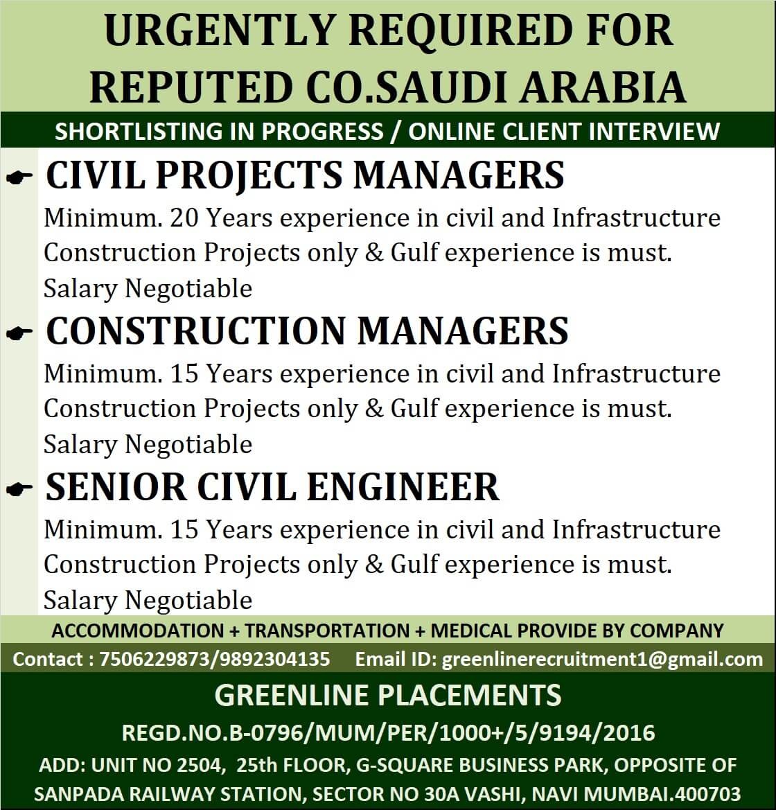 Candidates must have 15 - 20 years experience in civil & infrastructure projects