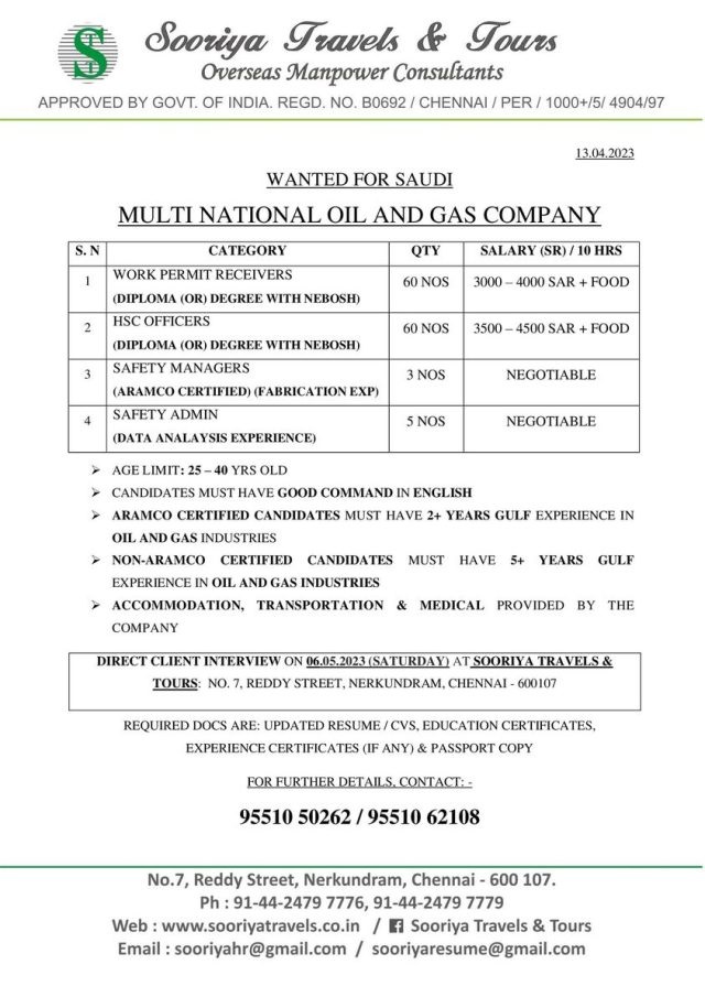 Age Limit : 25-40 years Old, Candidates must have good command in English. Aramco Certified Candidates must have 2+ years Gulf experience in Oil & Gas Industries. Non-Aramco Certified Candidates must have 5+ years Gulf exp. in Oil & Gas Industries