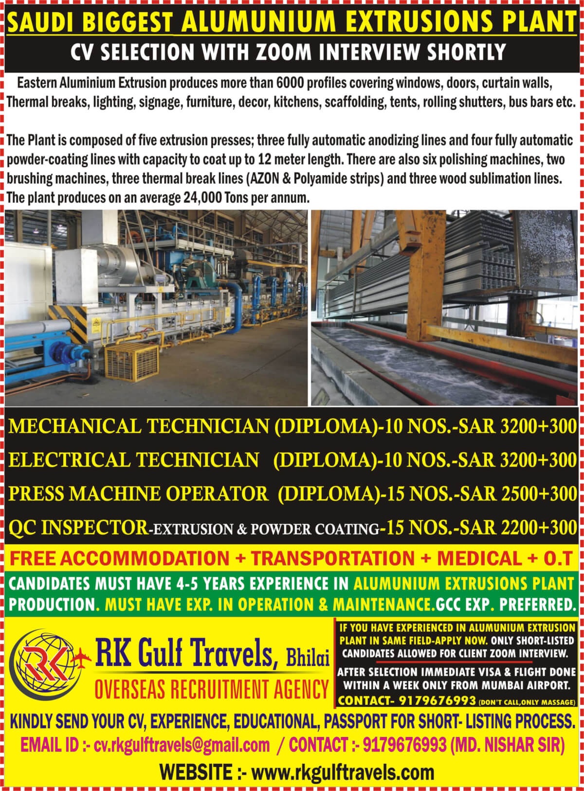 Candidates must have 4-5 years experience in Aluminum Extrusions Plant Production. Must have exp. in Operation & Maintenance. GCC exp. preferred.