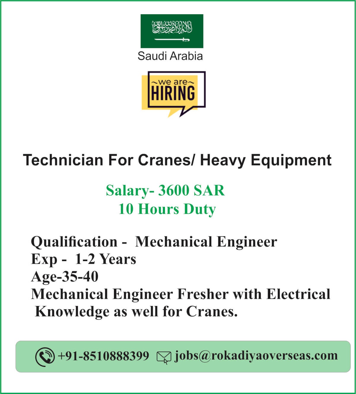 | Technician For Cranes/Heavy Equipment | 3600 SAR |