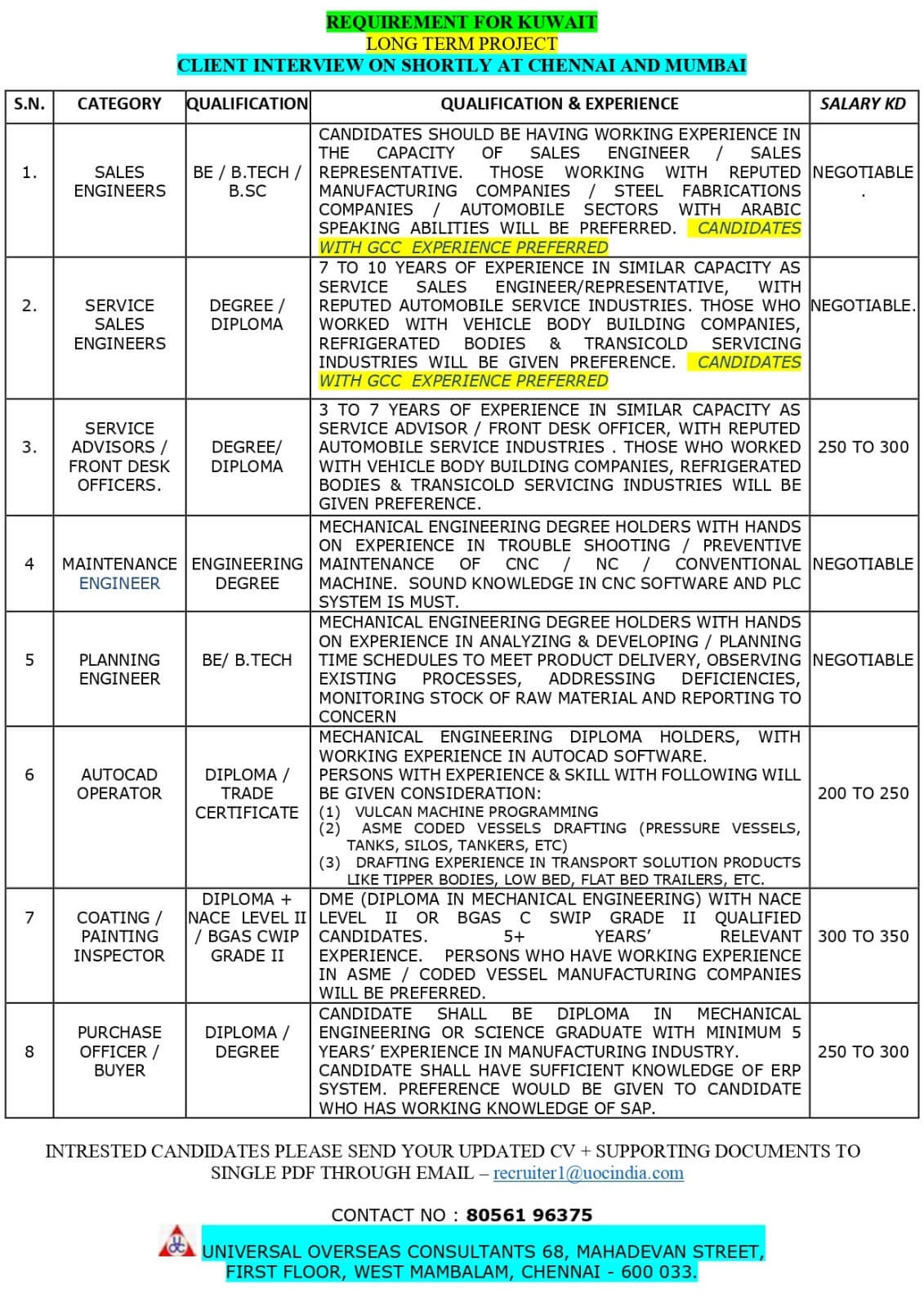 | Coating /Painting Inspector | 350 KWD | |