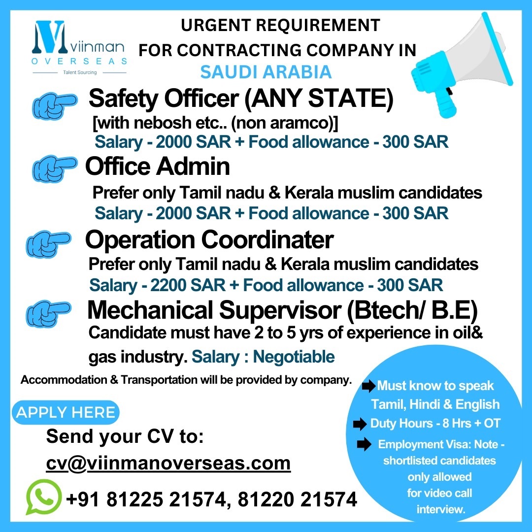 Must know to speak Tamil, Hindi & English. Duty Hours - 8 hours + OT. Employment Visa, and shortlisted Candidates only allowed for video call Interview.