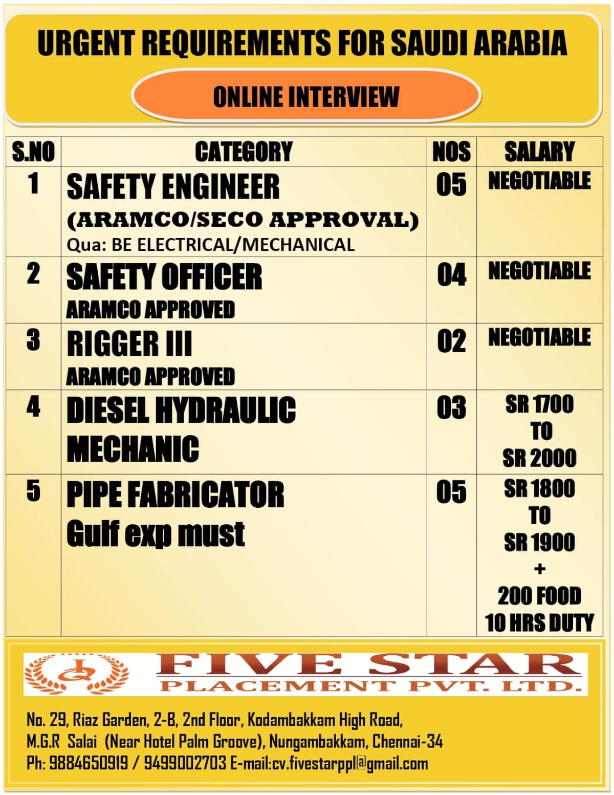Should have experience in their relevant field & should have Aramco/Seco Approval