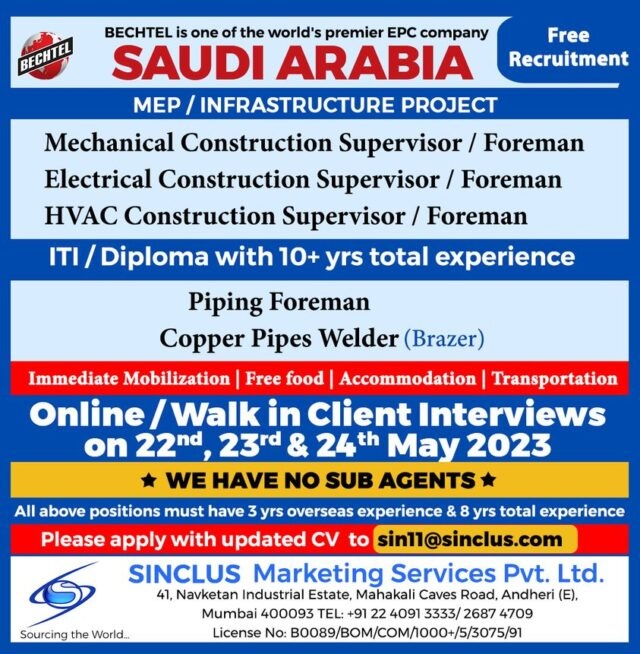 All above positions must have 3 years overseas experience & 8 years total experience. ITI / Diploma