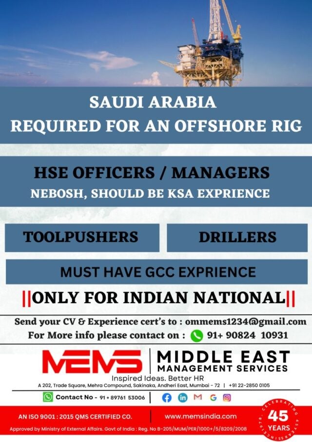 NEBOSH, must have GCC experience. Only for Indian Nationals