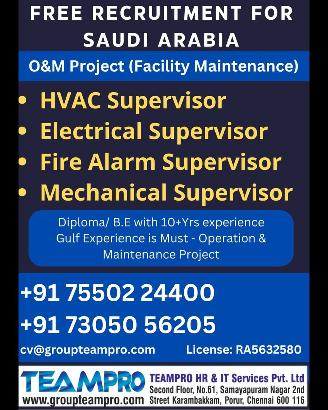 Diploma / B. E with 10 + years experience, Gulf experience is must in Operation & Maintenance Project.