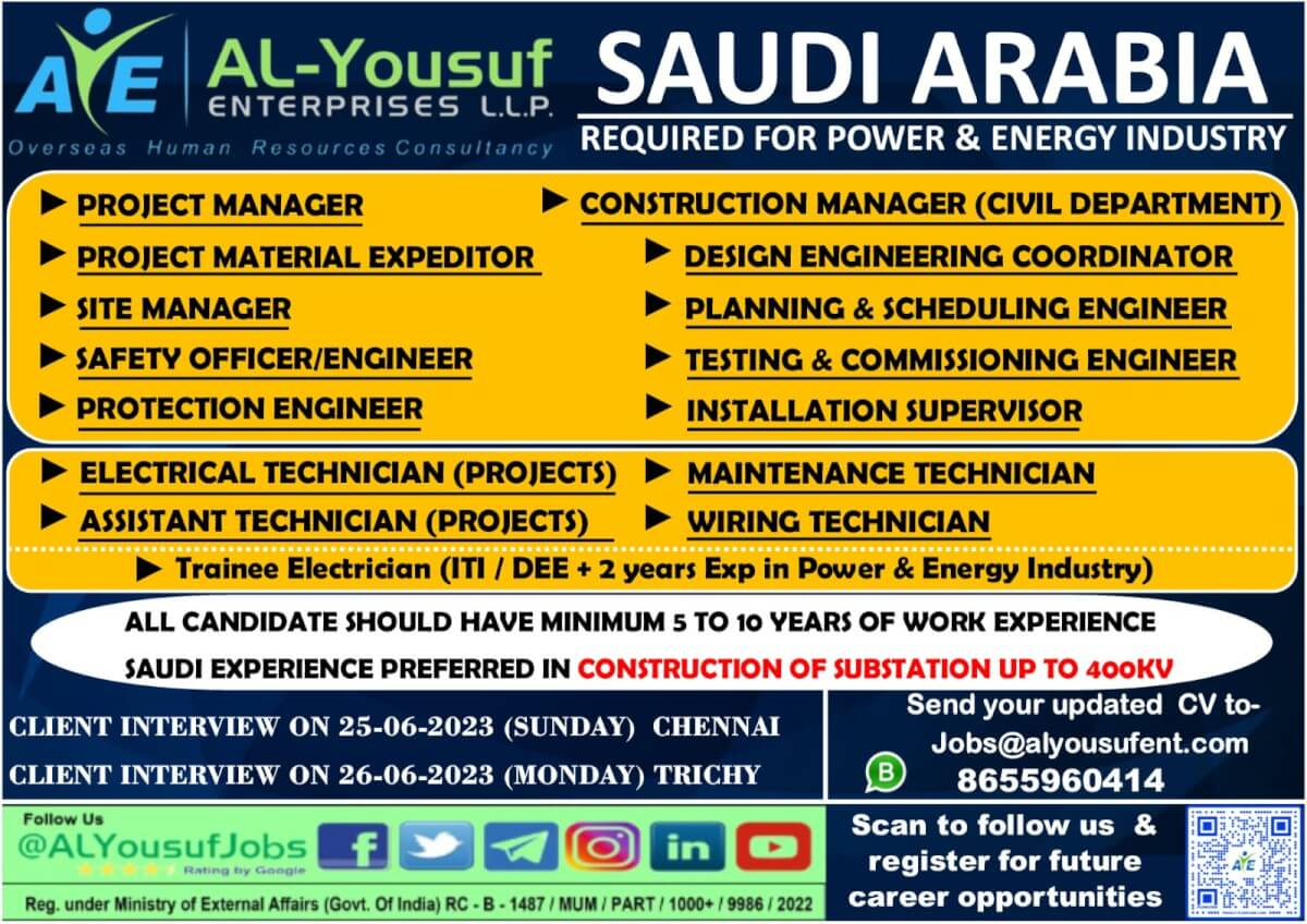 All Candidates should have Minimum 5 to 10 years of work experience. Saudi experience in Construction of Substation up to 400KV