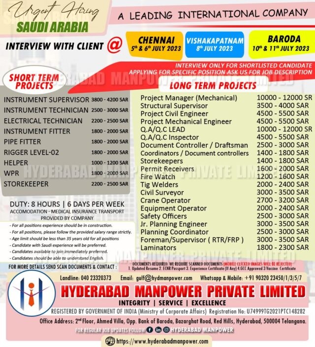 Email: gulf@hydmanpower.com / 040 23320373, 9032023450, 1, 3, 5, 7