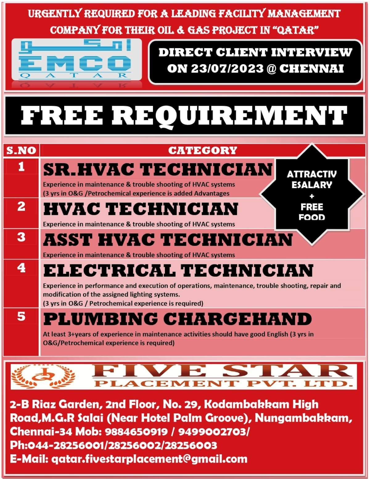 Email: qatar.fivestarplacement@gmail.com / Contacts : 9884650919, 9499002703, 044-28256001, 282566002, 282566003