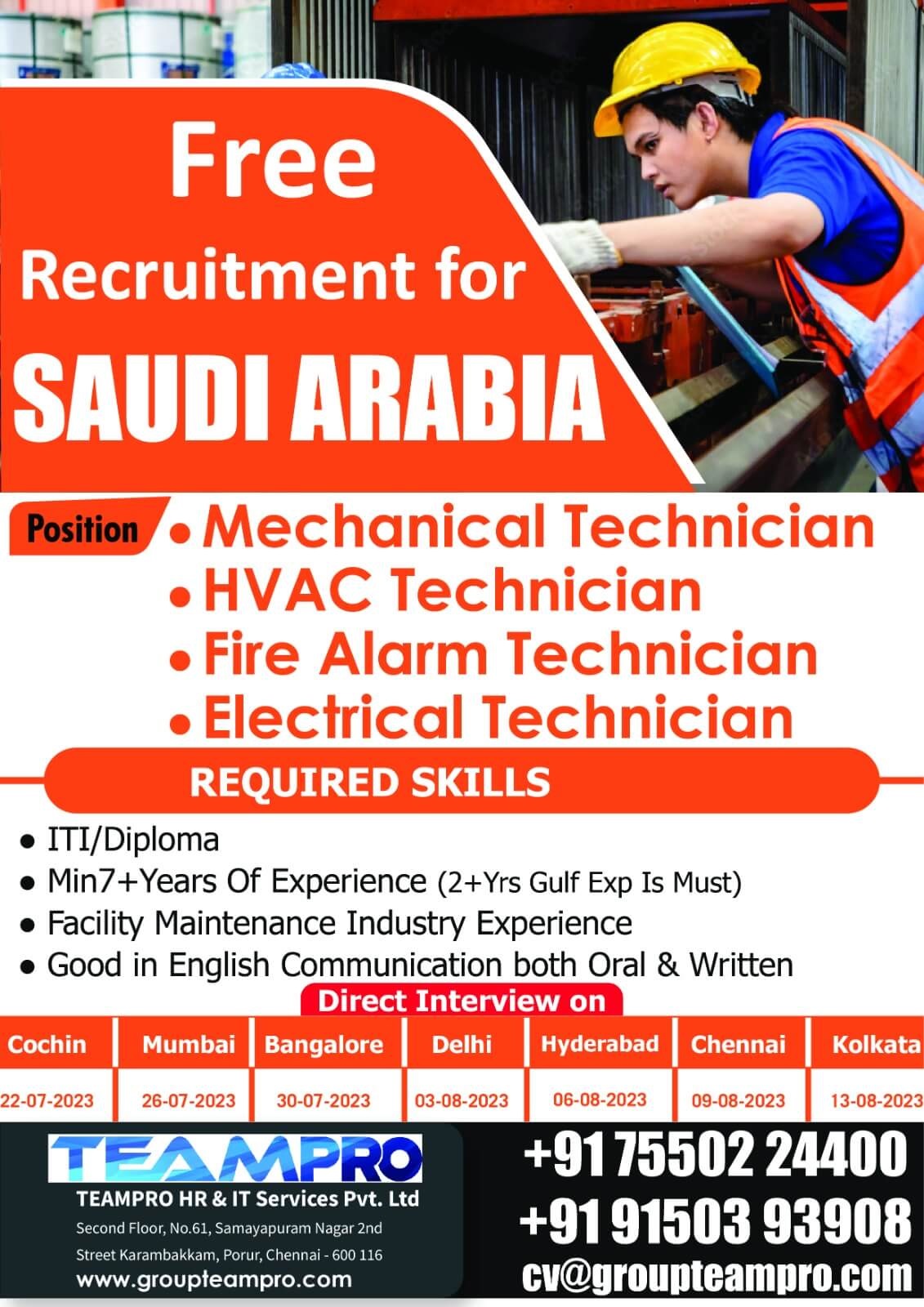 ITI / Diploma, Minimum 07 + years of experience (2+ Years Gulf Experience is must). Facility Maintenance Industry experience, Good in English Communication both Oral & Written