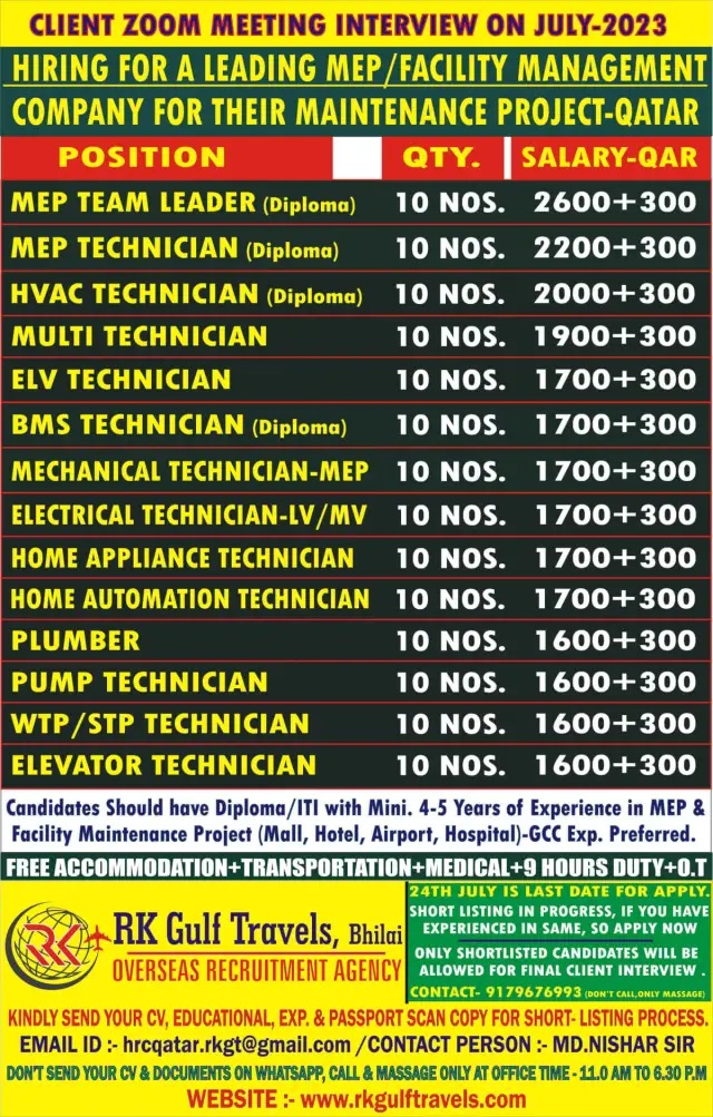 Candidates should have Diploma/ITI with Minimum 4 to 5 years of experience in MEP & Facility Maintenance Project (Mall, Hotel, Airport, Hospital). GCC Experience preferred. 9 hours duty + O.T
