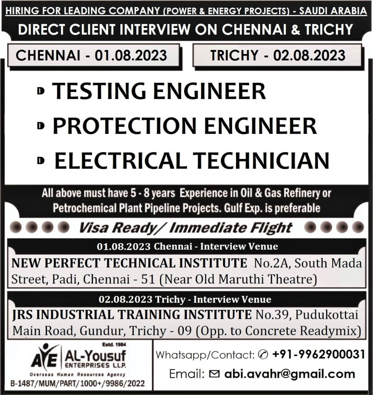 All above must have 5 to 8 years experience in Oil & Gas Refinery or Petrochemical Plant Pipeline Projects. Gulf Experience is preferable