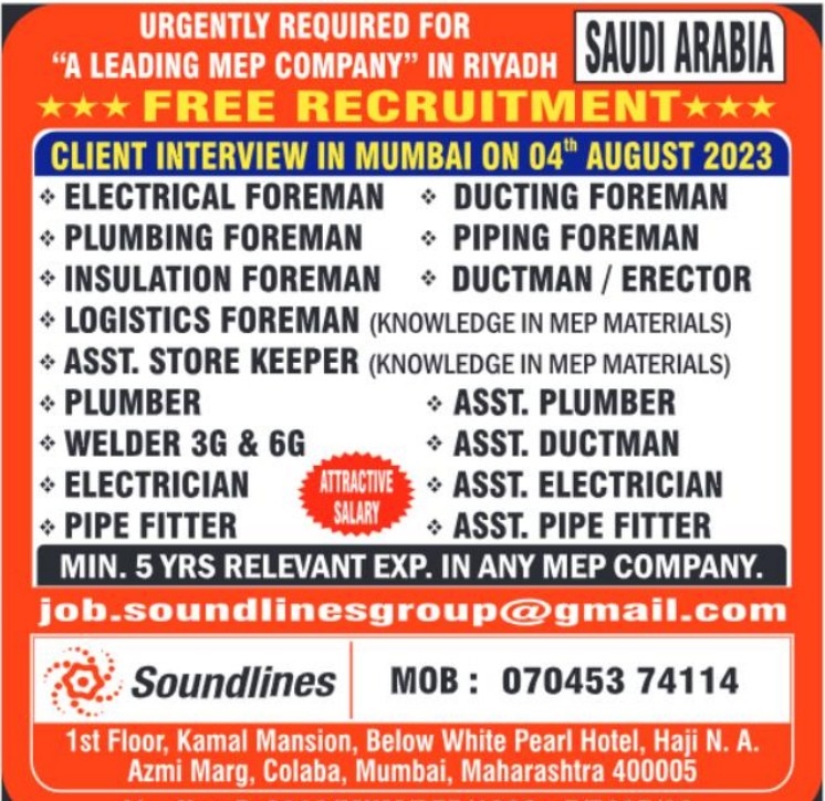 Email: job.soundlinesgroup@gmail.com / Contacts : 7045374114