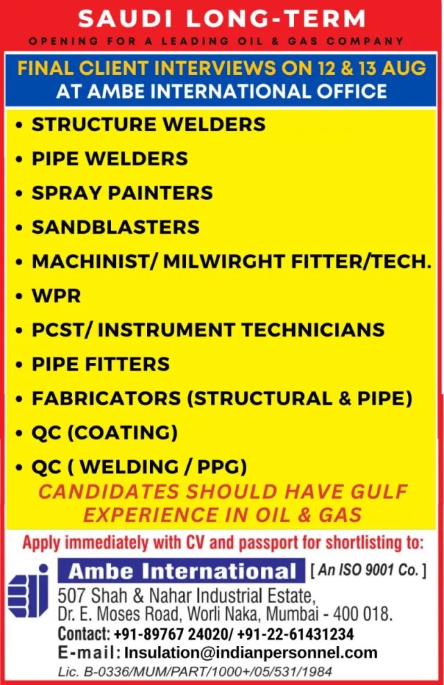 Recruitment to Oil & Gas Company in Saudi Arabia