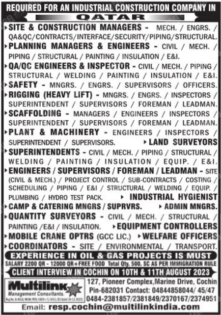 Site & Construction Managers : Mechanical/Engineers/QA & QC/Contracts Interface/Security/Piping/Structural | ||
