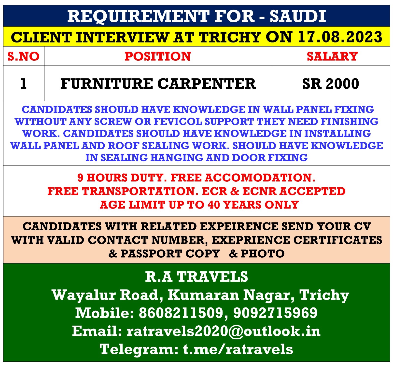Candidates should have knowledge in Wall Panel Fixing without any acrew or Fevicol Support they need Finishing work. Candidates should have knowledge in installing Wall Panel and Roof Sealing work. Should have knowledge in Sealing Hanging and Door fixing. 09 hours duty. ECR & ECNR Accepted. Age Limit up to 40 years only