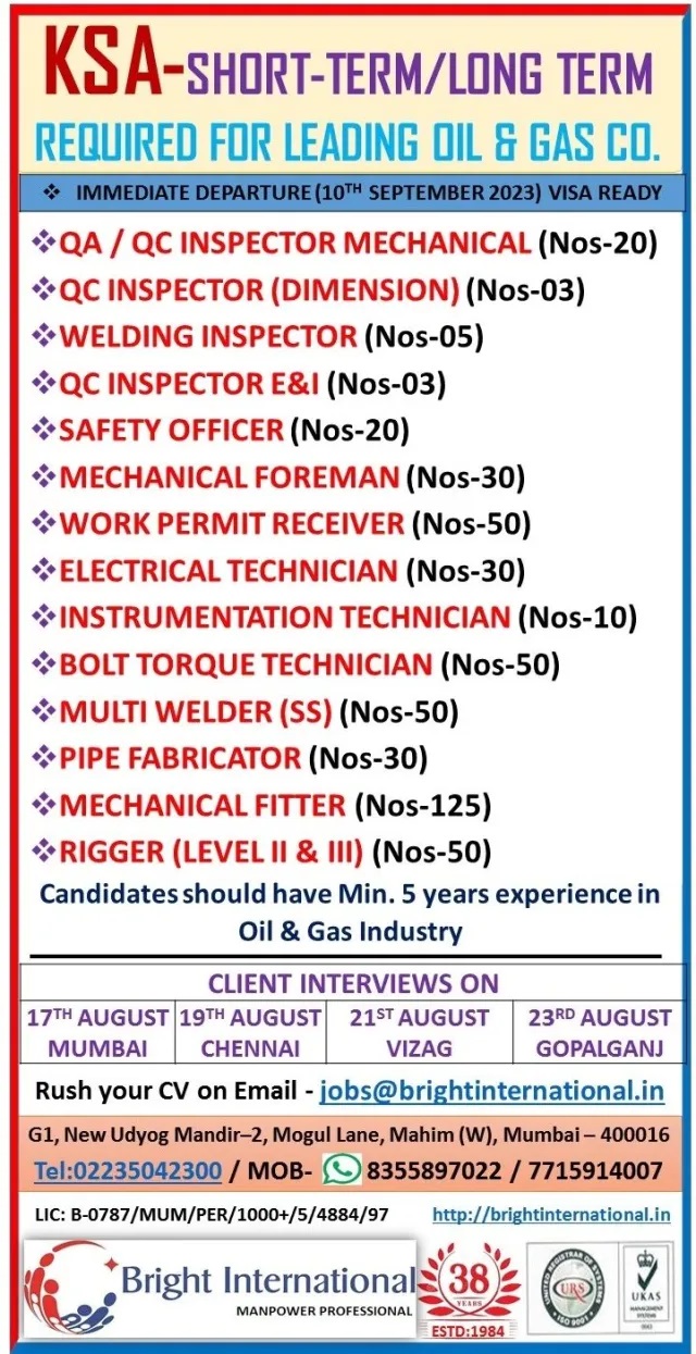 Email : jobs@brightinternational.in / Contacts : 8355897022, 7715914007, 022 35042300