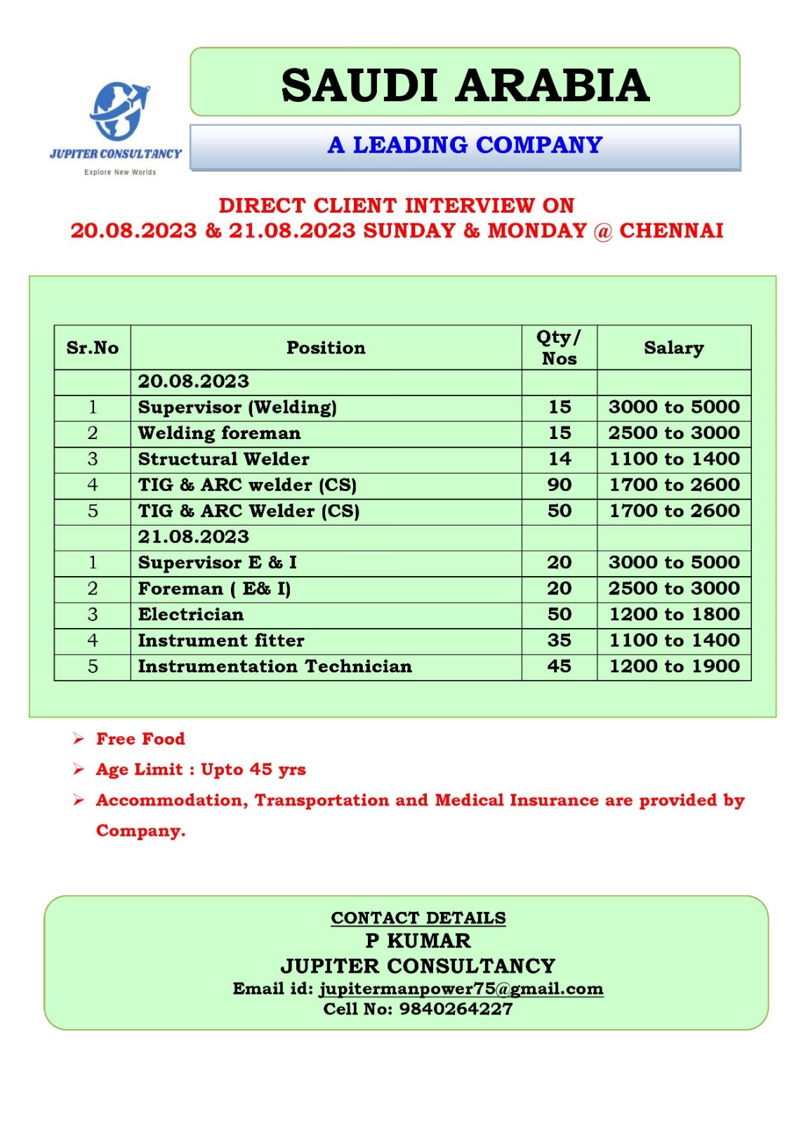 Email : jupitermanpower75@gmail.com / Contacts : P. Kumar : 9840264227