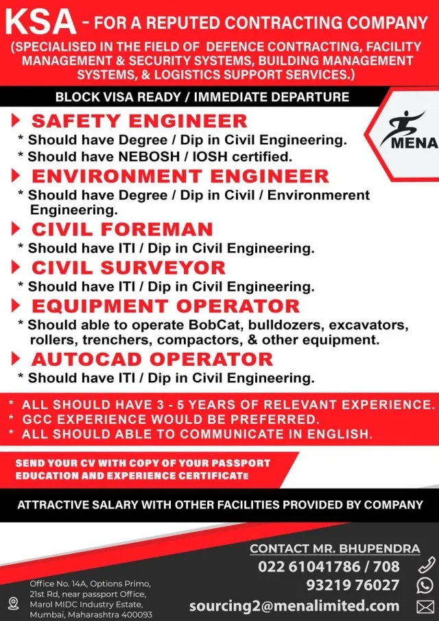 Email : sourcing2@menalimited.com / Contacts : Mr. Bhupendra 022 61041786, 708, 9321976027