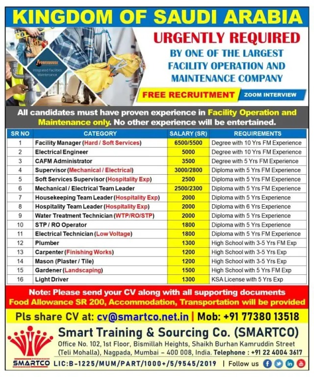 Free recruitment to Saudi arabia - Facility Operation & Maintenance Company