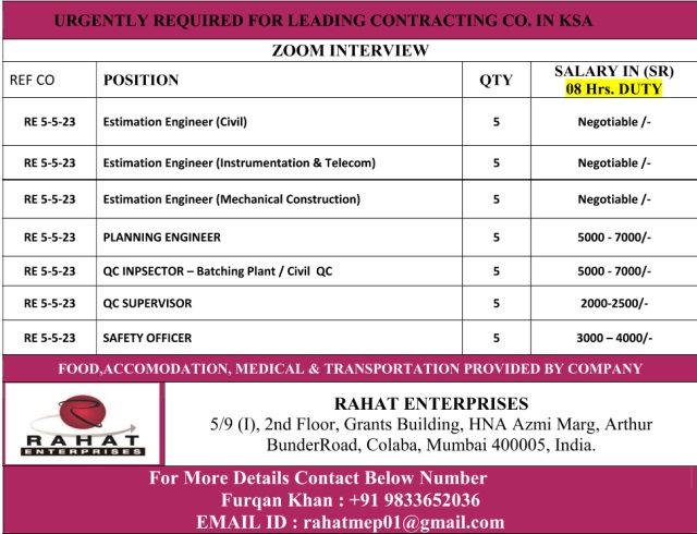 Urgently required for Contracting company in KSA