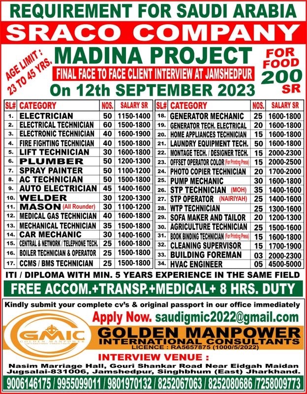SRACO Company jobs in Saudi Arabia 2023 - Madina Project